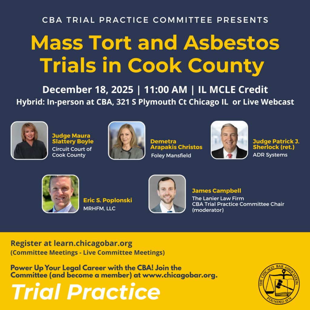 On December 18, 2025, James Campbell moderated a distinguished panel for the Chicago Bar Association’s Trial Practice Committee entitled “Mass Tort and Asbestos Trials in Cook County.” The hybrid event, held at CBA headquarters and broadcast via live webcast, brought together leading voices in Cook County asbestos litigation: Judge Maura Slattery Boyle of the Circuit Court of Cook County, retired Judge Patrick J. Sherlock of ADR Systems, defense attorney Demetra Arapakis Christos of Foley Mansfield, and plaintiff’s attorney Eric S. Poplonski. The program offered Illinois Continuing Legal Education (“CLE”) credit for attorneys and drew practitioners from across the country seeking insights into one of the nation’s most active asbestos litigation dockets.